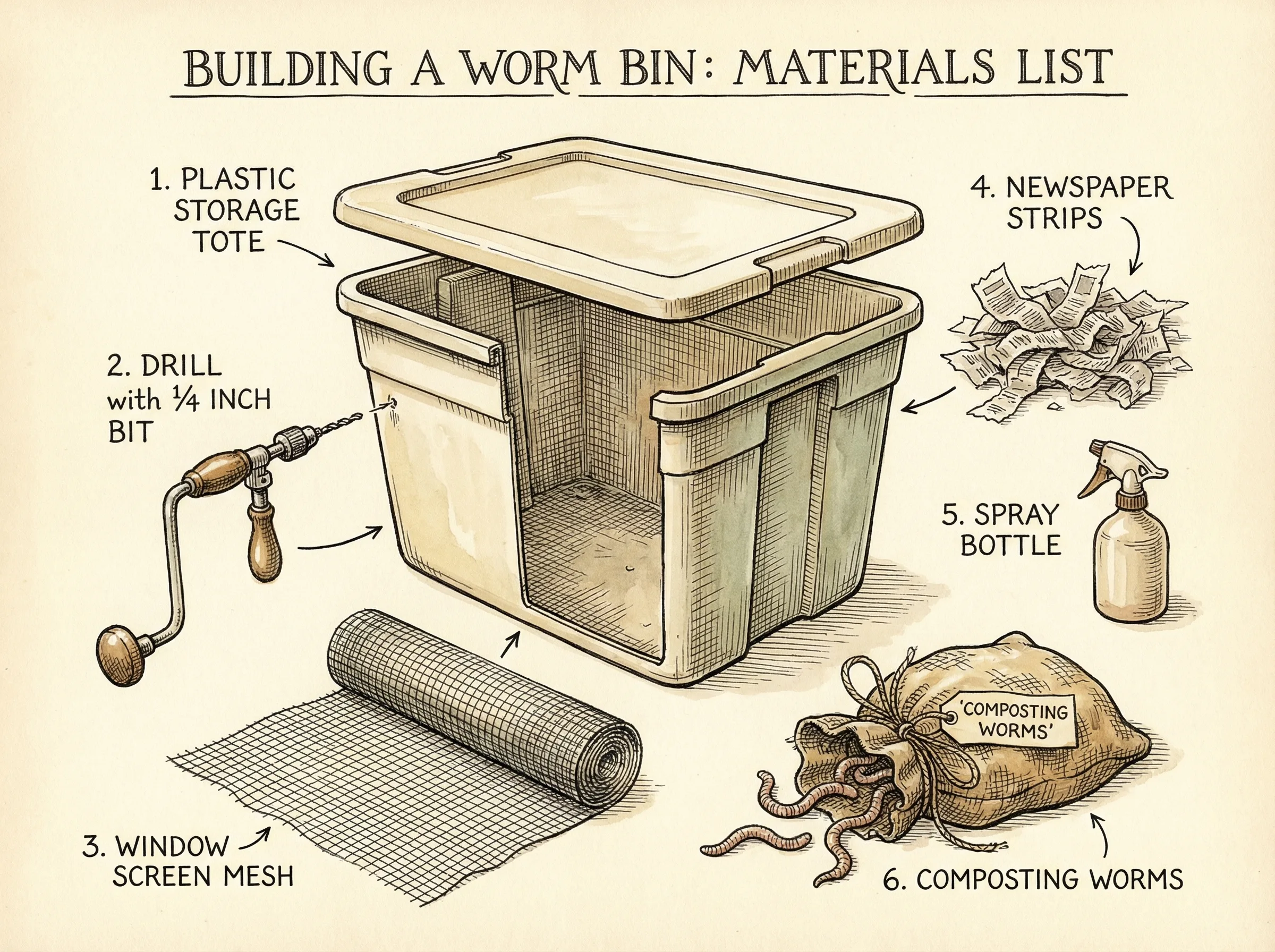 - 1 opaque plastic storage tote (8-14 gallon / 30-53 liter) with lid. Don't use clear plastic — worms need darkness. Rubbermaid Roughneck totes work great.