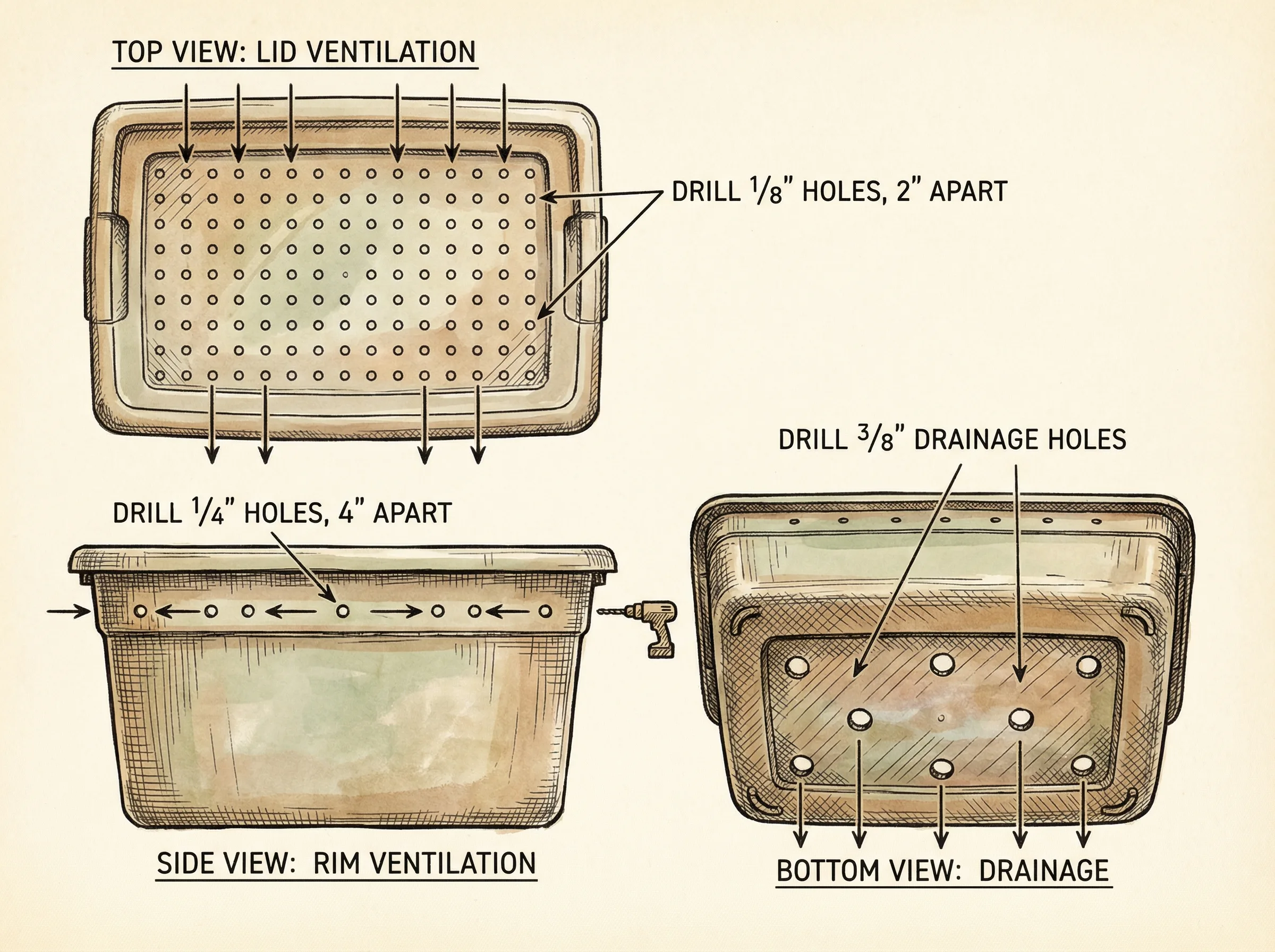 - Lid: Drill ventilation holes in the top lid just like the tote bin.